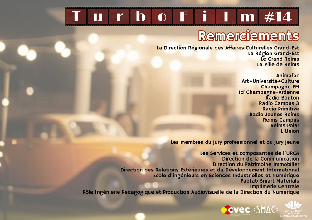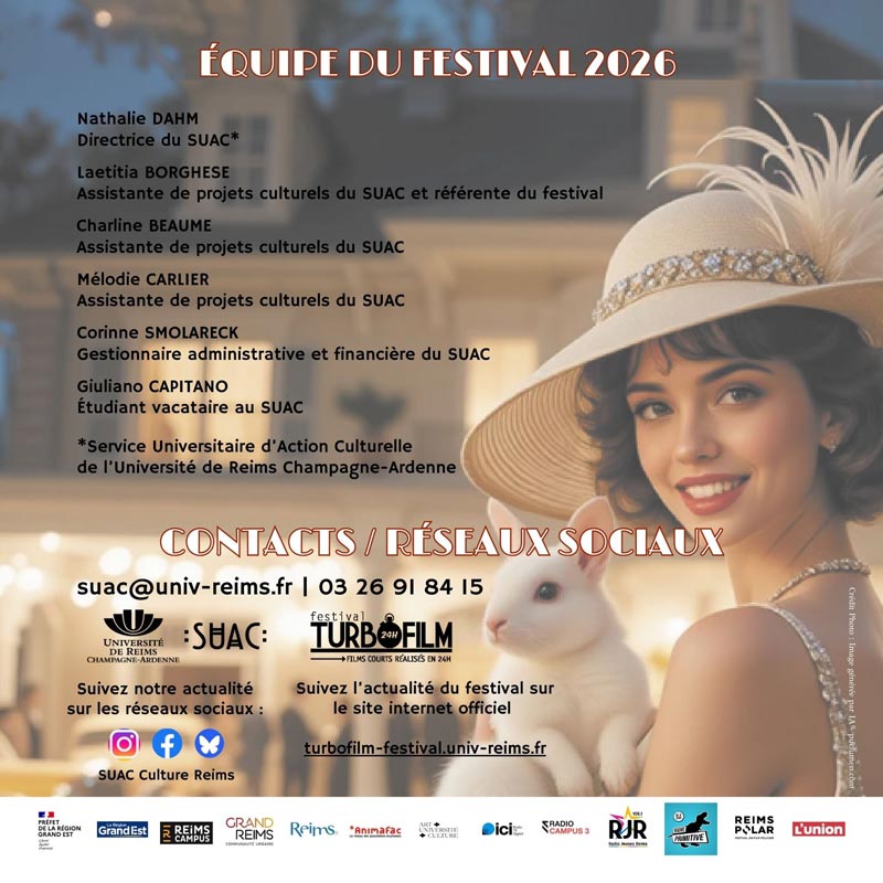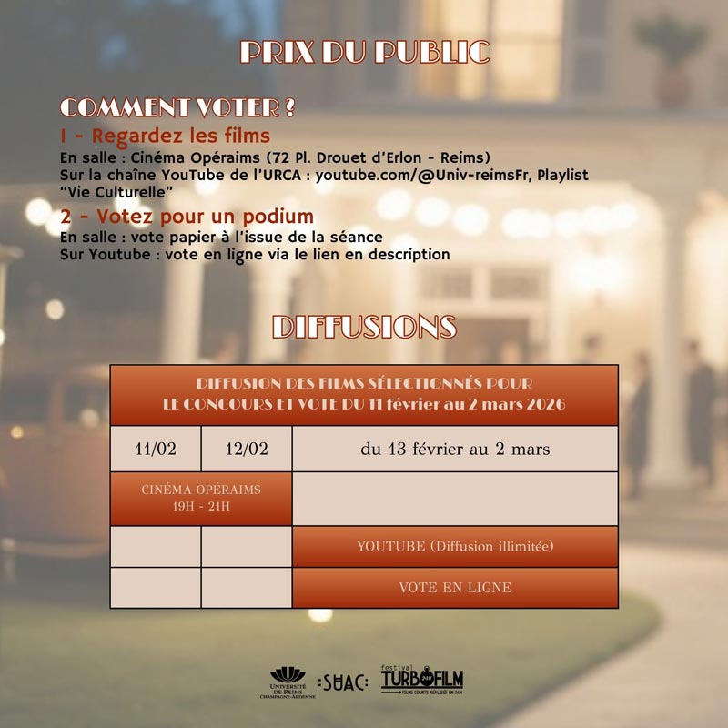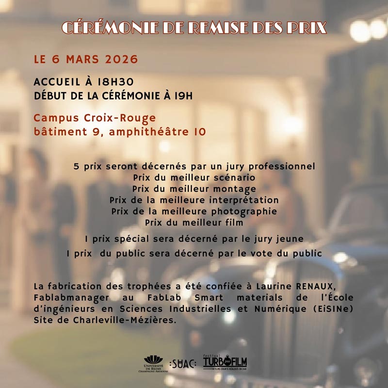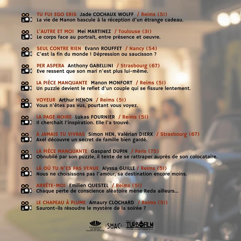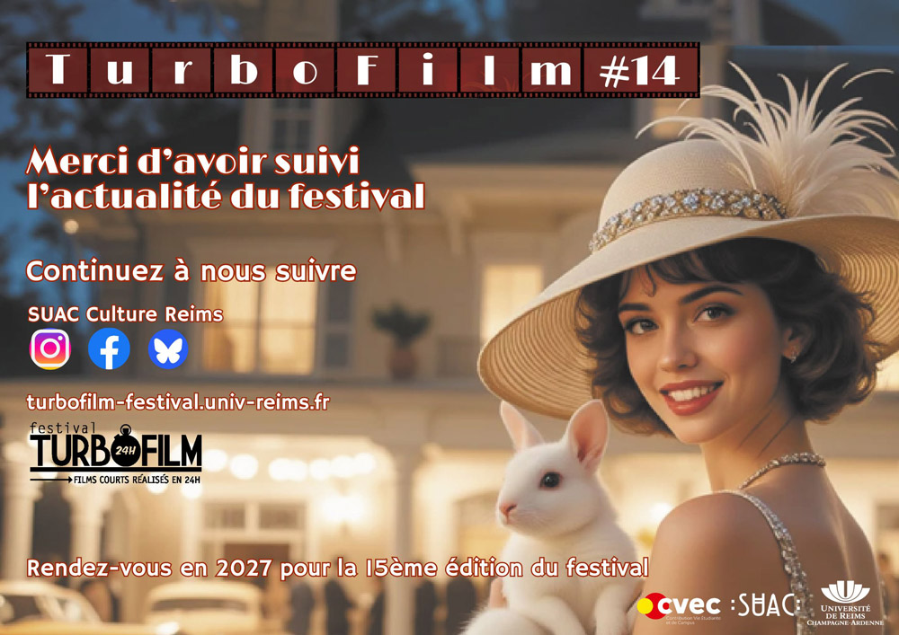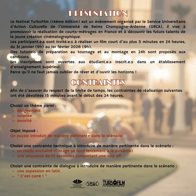 Le festival TurboFilm (14ème édition) est un événement organisé par le Service Universitaire d’Action Culturelle de l’Université de Reims Champagne-Ardenne (URCA), il vise à promouvoir la réalisation de courts-métrages en France et à découvrir les futurs talents de la jeune création cinématographique. Les participant-e-s ont été invité-e-s à réaliser un film court de 5 minutes maximum, du 31 janvier (9h) au 1er février 2026 (9h).